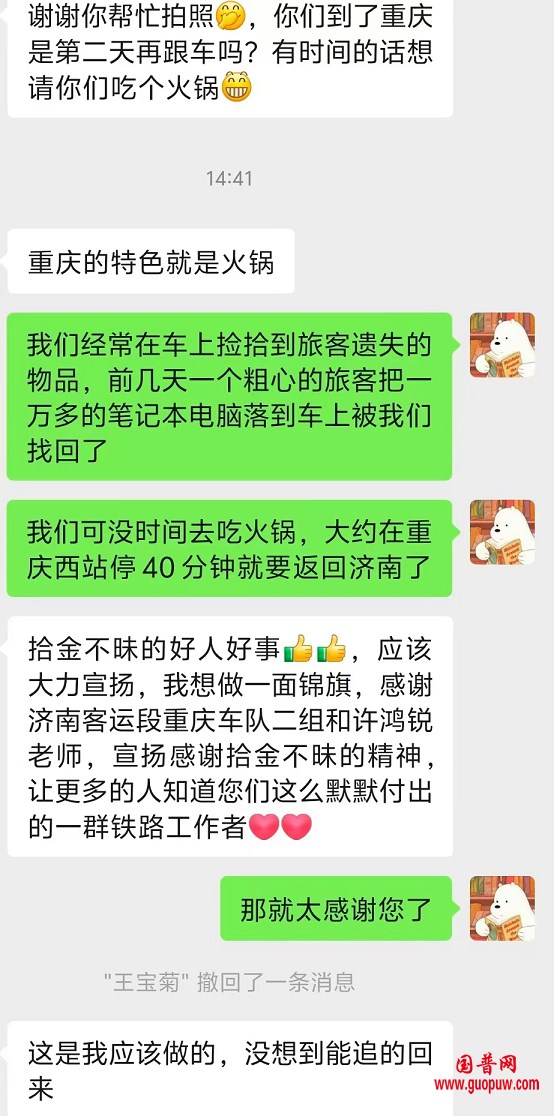 2024年8月23日班组再次值乘K15次列车,旅客主动制作锦旗在站台等候列车进站,当面找到我车乘务员许鸿锐,对许鸿锐拾金不昧的品德表示感谢。