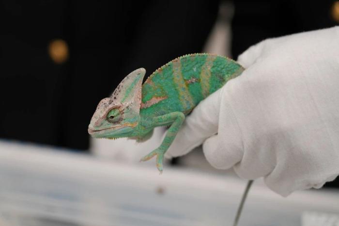 据“海关发布”微信公众号消息,近日,皇岗海关在福田口岸旅检进境渠道查获旅客人身绑藏走私濒危变色龙10只、外来物种伞蜥4只、卵胎蜥属物种1只。