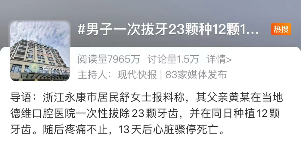 9月3日,永康市卫生健康局回应,当事人的父亲是在该口腔医院拔牙十多天后去世。至于其是否在一天内拔除了23颗牙,以及死亡是否与就诊有直接关联等问题正在调查,涉事医院也在配合调查。