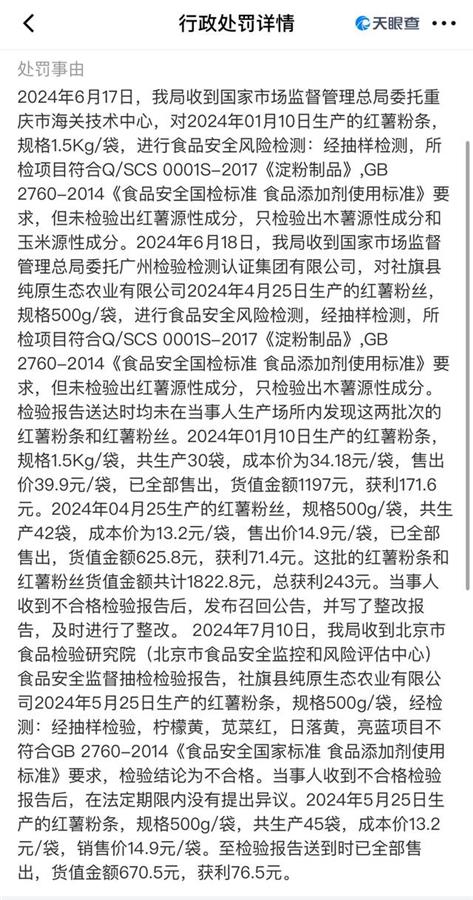 处罚原因为,社旗县市场监督管理局收到国家市场监督管理总局委托检测机构的抽样检测信息,该厂商今年1月10日生产的红薯粉条,经抽样检测未检验出红薯源性成分,只检验出木薯源性成分和玉米源性成分;该厂商4月25日生产的红薯粉丝,经抽样检测,未检验出红薯源性成分,只检验出木薯源性成分。检验报告送达时均未在当事人生产场所内发现这两批次的红薯粉条和红薯粉丝。