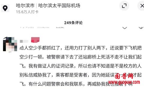 另一位疑似同航班的网友评论称,“同一班飞机,这女的起飞不肯收小桌板,空少劝阻无效,还说要打人。我真是服了,耽误我们一个多小时,空少胳膊都是抓痕。”
