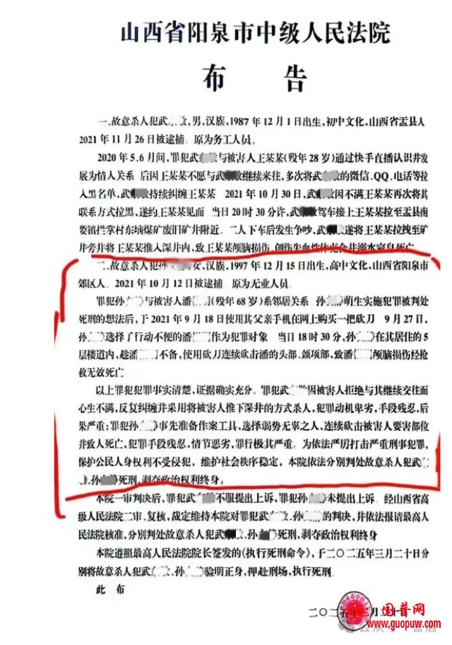 6月9日,有媒体记者从山西省阳泉市中级人民法院获悉,该布告确为该院发布。1997年出生的孙某某想通过实施犯罪而达到被判处死刑的目的。她通过网购砍刀,将隔壁行动不便的邻居杀害,最终被执行死刑。