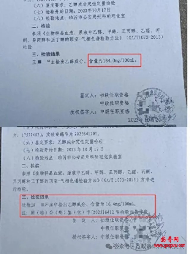 上海司法鉴定科学研究院复检结果王先生告诉大皖新闻记者,事后他便拿着这份报告去平邑县交警部门讨要说法。王先生称,当时肇事科一名工作人员又拿出另一份报告,其中尸血检测中乙醇含量为16.4mg/100ml,“他们就是说工作人员录入时点错了一个小数点。”随后,王先生也向记者提供了这份报告,记者注意到在报告最下方还有一行备注,写到“原(临)公(刑)鉴(化)字【2023】6412号检验报告作废。”该报告落款日期为2023年11月17日,而作废的正是同年10月20日出具的检测出尸血中乙醇含量164mg/100ml的那份报告。