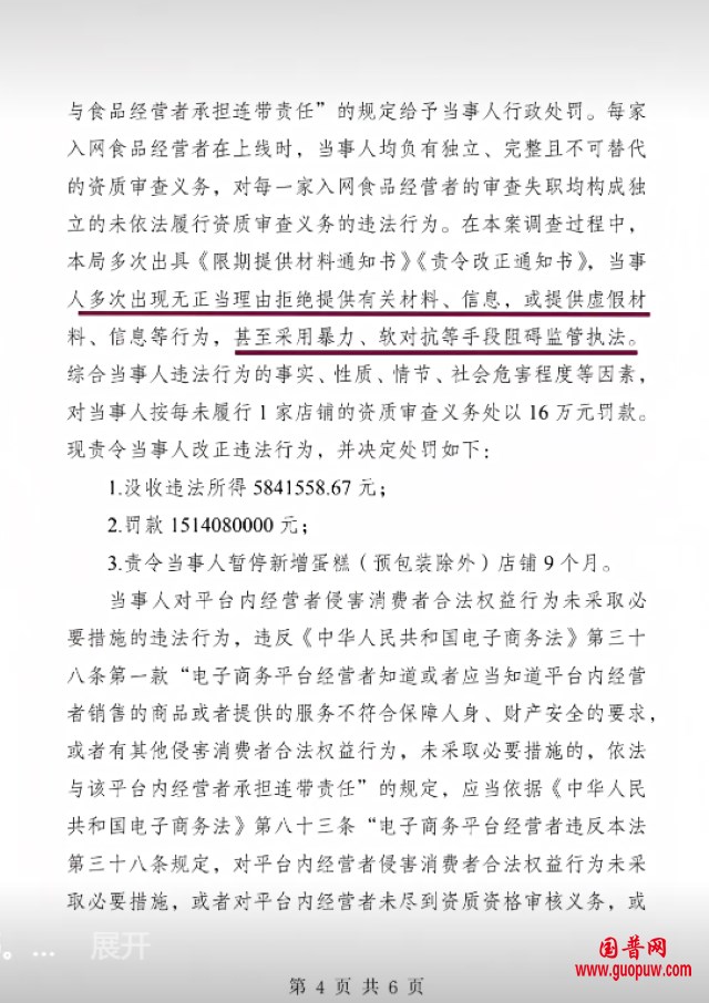 “在调查过程中,本局多次出具《限期提供材料通知书》《责令改正通知书》,当事人(拼多多)多次出现无正当理由拒绝提供有关材料、信息,或提供虚假材料、信息等行为,甚至采用暴力、软对抗等手段阻碍监管执法。综合当事人违法行为的事实、性质、情节、社会危害程度等因素,对当事人按每未履行1家店铺的资质审查义务处以16万元罚款。